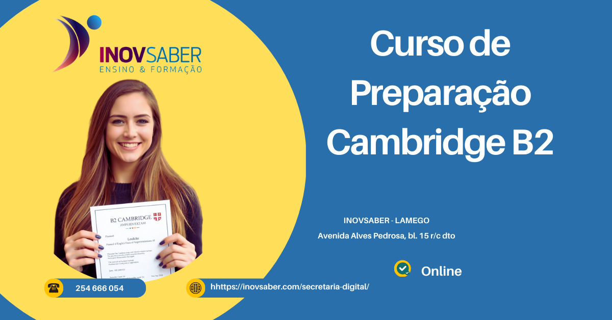 Destina-se a que perceba se está realmente preparado para fazer o Cambridge B2 First, explicar-lhe a estrutura do exame, dar algumas dicas e praticar. Após a conclusão com sucesso poderá candidatar-se à realização do exame Cambridge B2 First que é pago à parte.